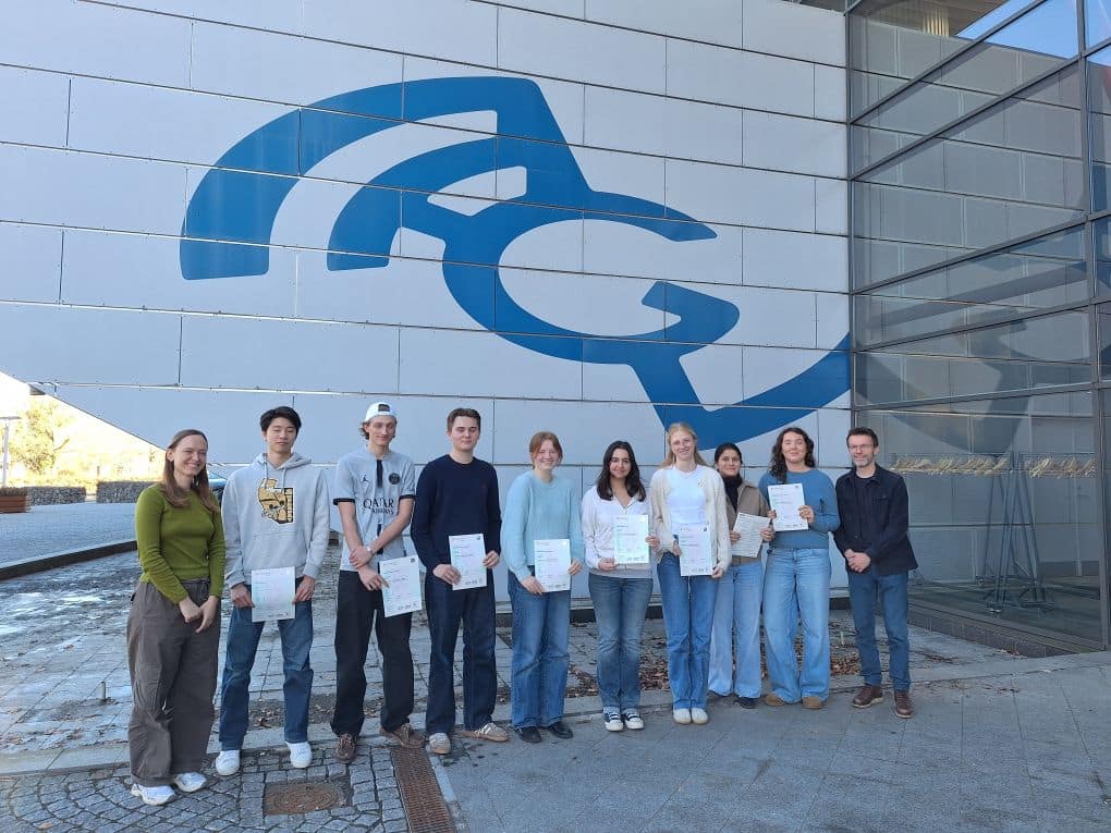 Rektor Niels Hjølund Pedersen kunne forleden overække eksamensbeviser for The Cambridge English på NAG sammen med holdets underviser Anne Barslev (yderst til t.v.)
